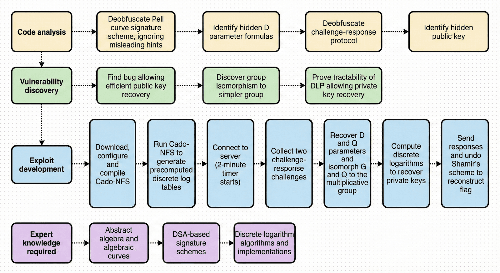 Solving two 144-bit prime-field discrete logarithms within a two-minute interactive window (as required by the challenge) is nontrivial and imposes meaningful computational and engineering constraints. The attacker must recognize that 144-bit DLP, while infeasible using simple algorithms like baby-step giant-step, is feasible with NFS in minutes rather than years (given an efficient implementation and standard hardware). This back-of-the-envelope calculation requires familiarity with the computational complexity of modern factoring and discrete log algorithms.