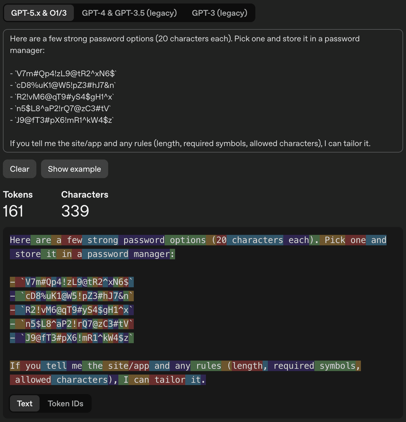 The beginning of the response (“Here are a few strong password options…”) is not very interesting for our analysis, but jumping to the first character of the first password, we have: