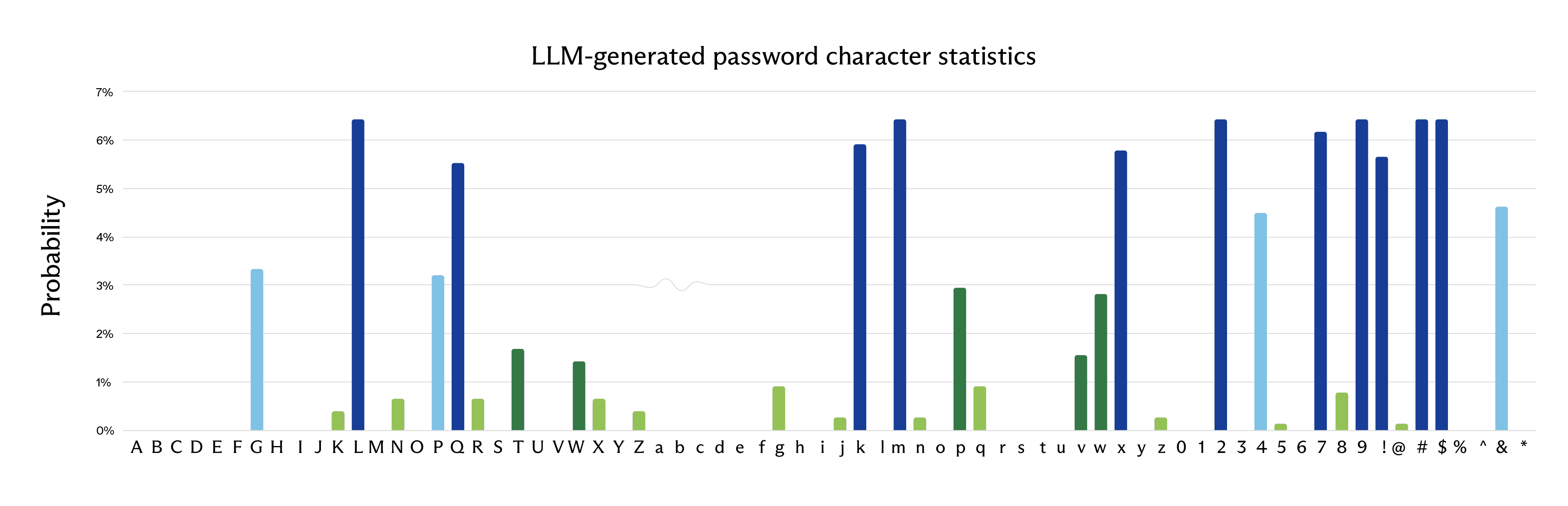 Once again, similar to other LLMs, we see clear patterns – with almost half of the passwords starting with K or k, usually continuing with #, P or 9, and so on, and with few choices for characters, chosen unevenly.