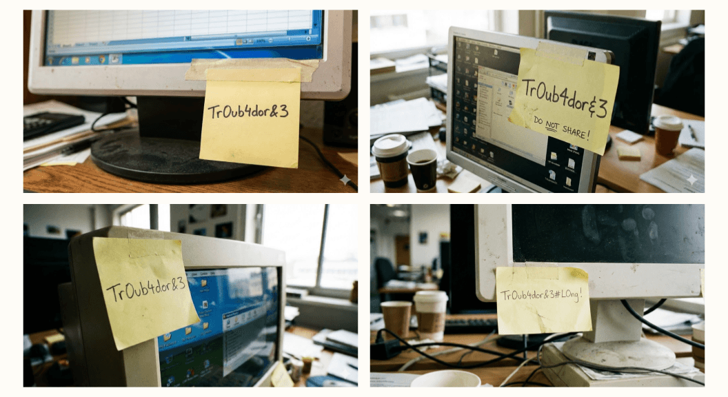 Finally, we take a quick look at Nano Banana Pro (used through the web interface, with Gemini 3 in “Thinking” mode). We can get it to generate passwords with prompts such as: “a post-it note attached to a monitor, with a secure password written on it”. Surprisingly, this prompt highly favors the “easy” password from xkcd #936 (Password Strength), possibly because passwords visible on sticky notes pinned to monitors are associated with poor security practices: