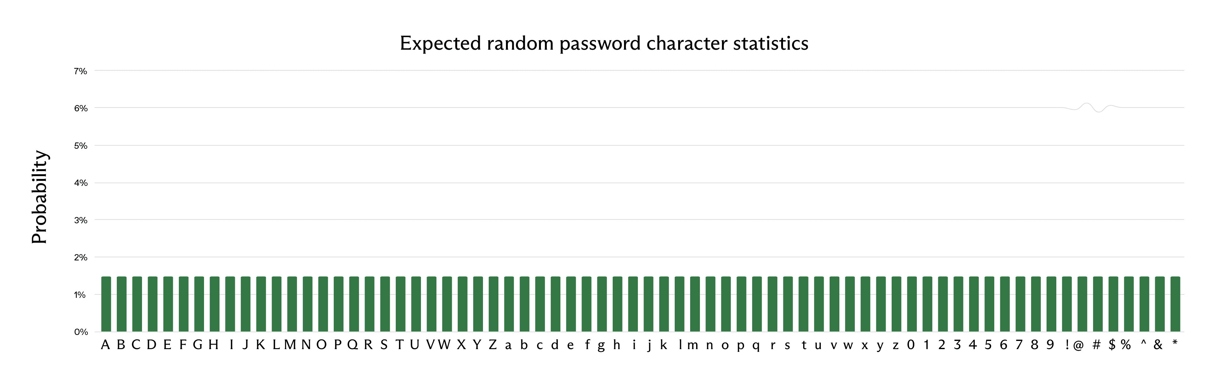 Looking at the list of 50 passwords generated by Claude Opus 4.6 given in the beginning of this post, here are the per-character probabilities for the entire set of passwords (ignoring, for now, the position of each character within the password):