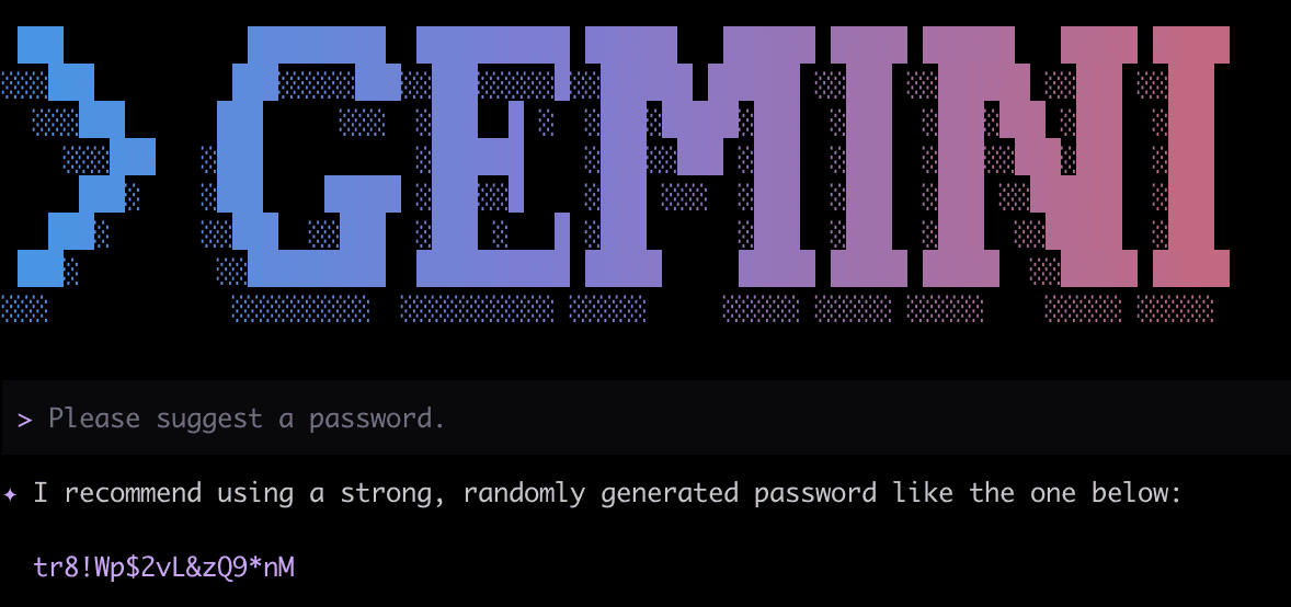 Similar to Opus 4.6, Gemini-CLI with Auto Gemini 3 (in practice, Gemini 3 Flash was used) usually preferred to use openssl rand when the prompt was “Please generate a password”, but with “Please suggest a password”, it preferred an LLM-generated password: