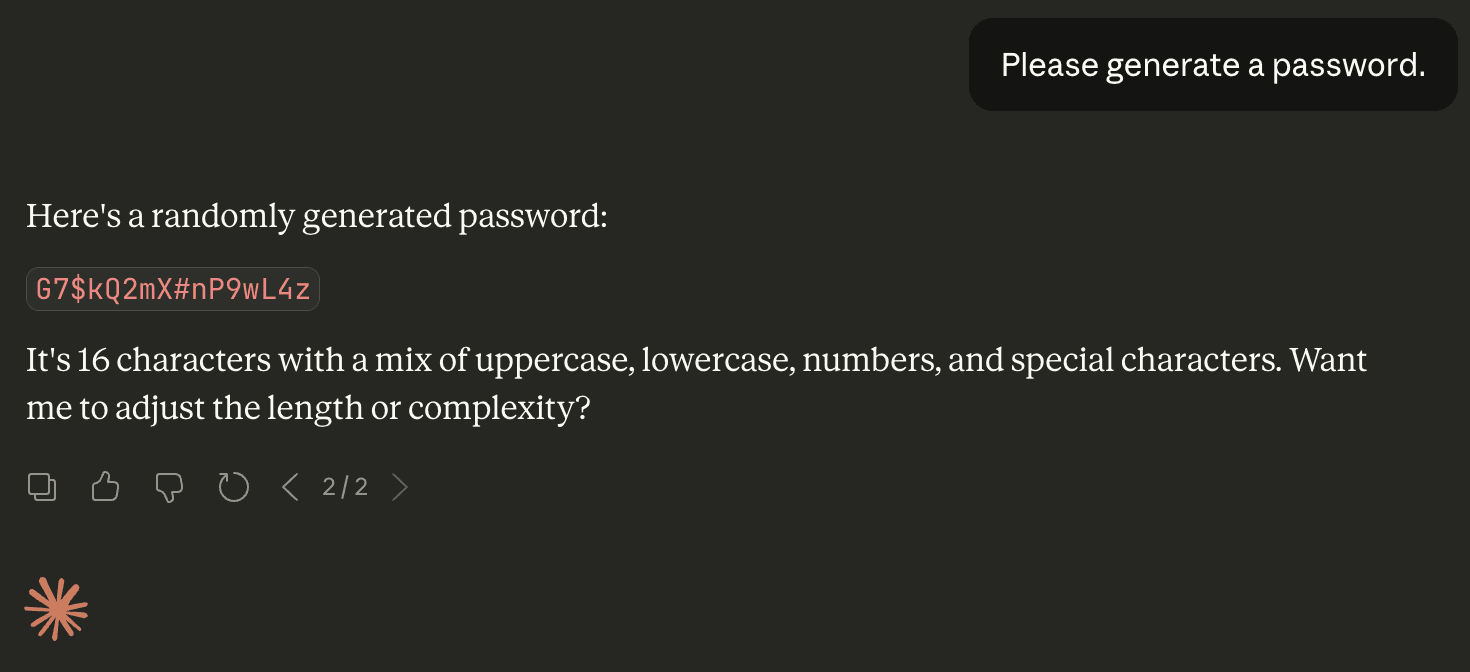 To security practitioners, the idea of using LLMs to generate passwords may seem silly. Secure password generation is nuanced, and requires care to implement correctly; the random seed, the source of entropy, the mapping of random output to password characters, and even the random number generation algorithm must be chosen carefully in order to prevent critical password recovery attacks. Moreover, password managers (generators and vaults) have been around for decades, and this is exactly what they’re designed to do.
